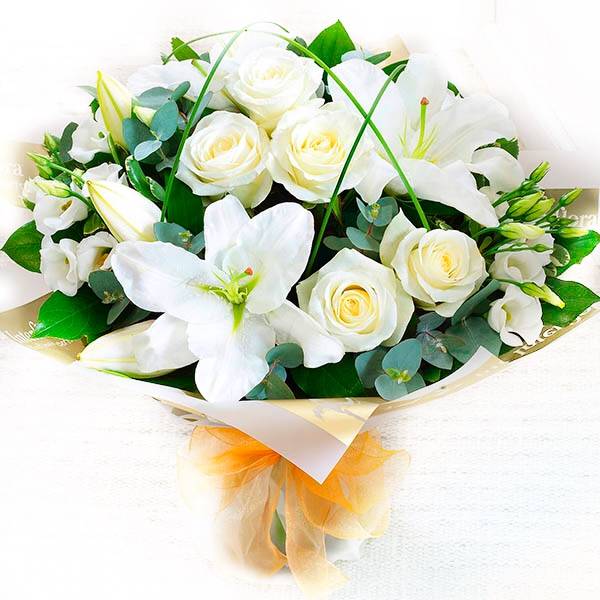 Удивительное сочетание белоснежных роз, лилий и лизиантусов, дополненных сочными веточками эвкалипта непременно придется по душе вашей любимой женщине, девушке, маме или сестренке. Дарить такой букет, излучающий только теплые, добрые и радостные эмоции, актуально на самые разные праздники: день Валентина, юбилей, годовщину, день рождения, выпускной и т.д. Так как белый цвет – символ чистоты и невинности, данная цветочная композиция послужит отличным решением для букета невесты.